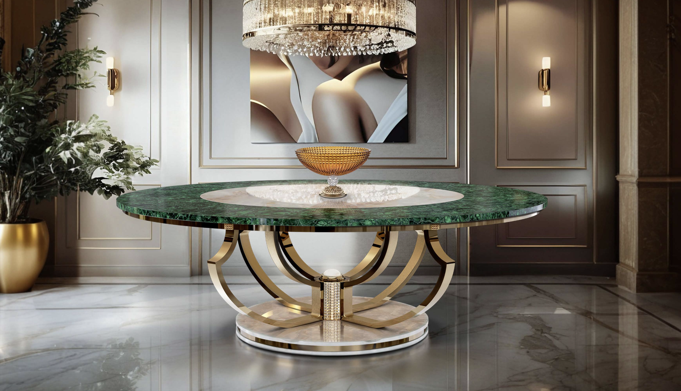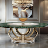 Redefining the art of dining, this majestic table is a commanding centerpiece crafted from a rare fusion of crystal, natural malachite, and white onyx, set atop a bold structure of 24K gold-plated detailing. Designed for those with a discerning eye for beauty and grandeur, every surface shimmers with depth, light, and refined opulence.